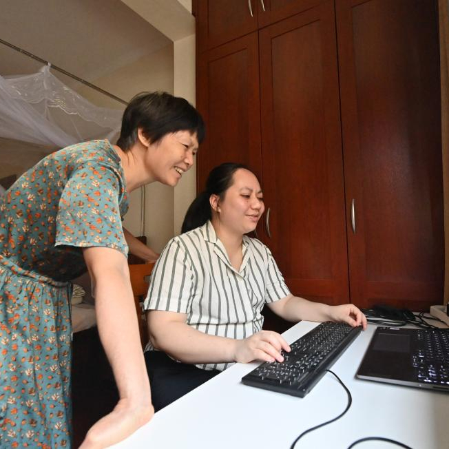8月13日,李莹(右)陪伴爱人邵学明在广西南宁市的家中学习。