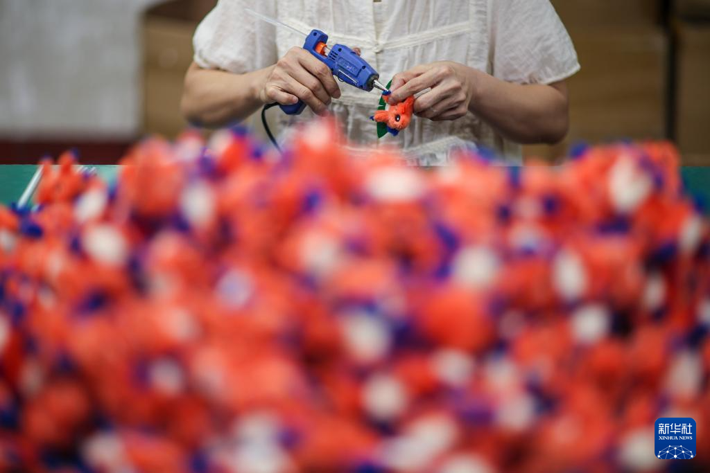 8月11日,在四川省达州市达川区景市镇红岩洞村诚兴外贸玩具加工厂,工人赶制出口欧美国家的包挂。