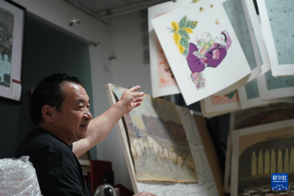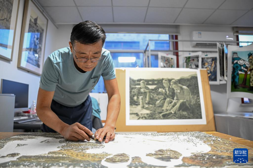 8月10日,在内蒙古扎鲁特旗版画院,画家齐同跃介绍自己正在创作的版画作品。