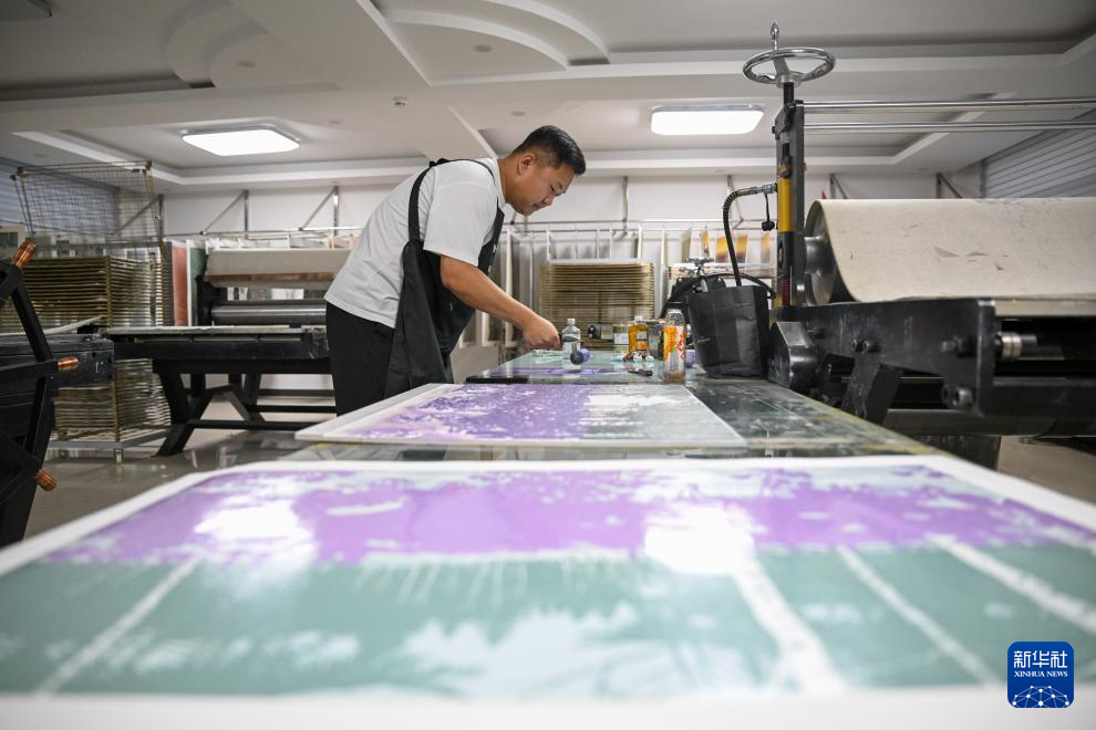 8月10日,在内蒙古扎鲁特旗版画院,画家陈其木格为作品调颜色。