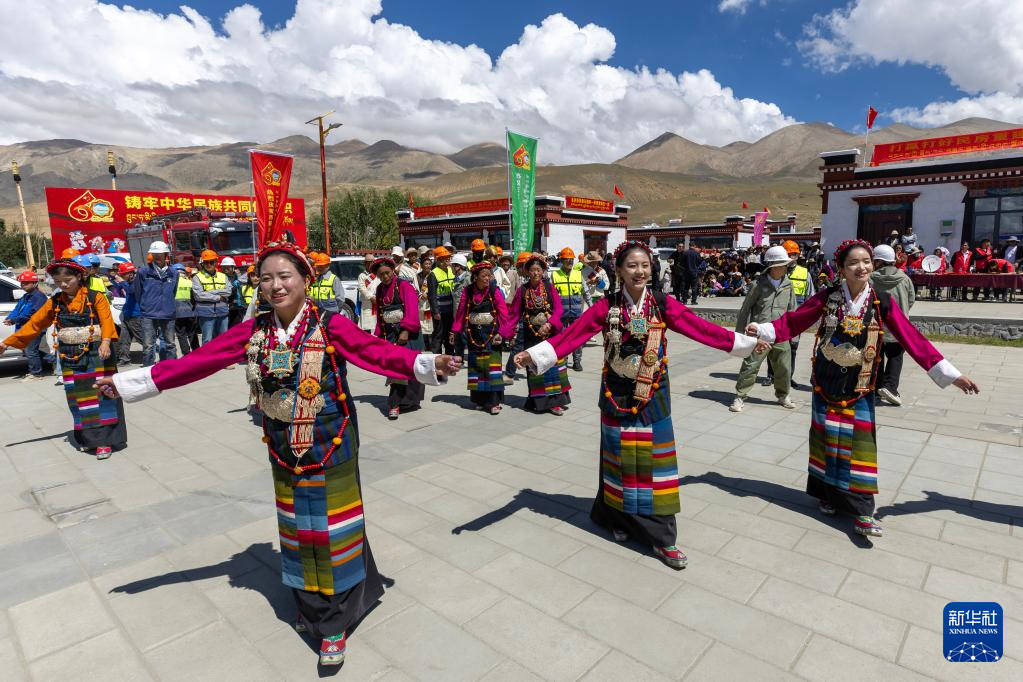 8月15日,西藏定日县森嘎村村民载歌载舞庆祝乔迁之喜。