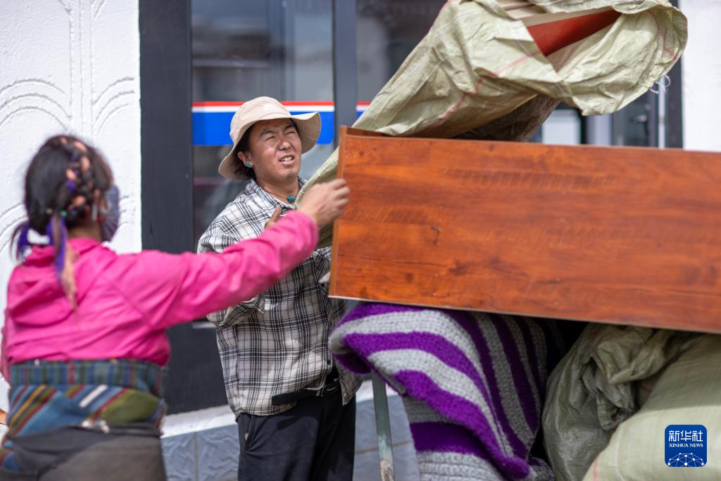 8月14日,西藏定日县森嘎村一户村民向新家搬运家具。