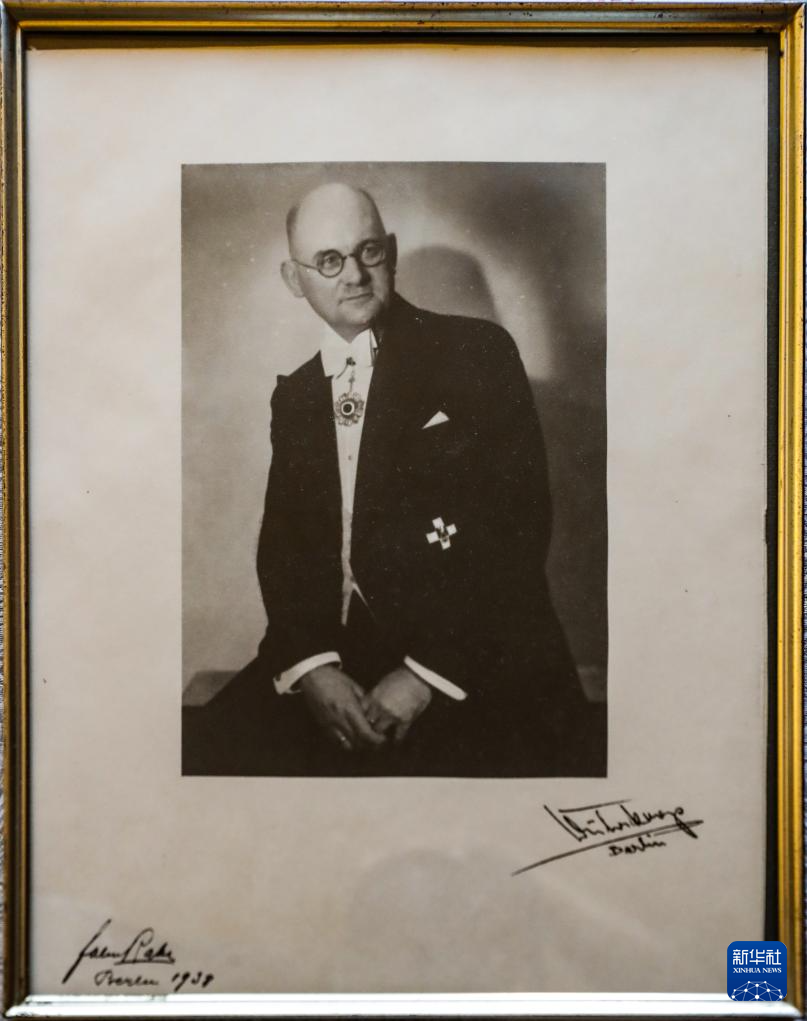 这张8月7日拍摄的照片展示的是德国海德堡约翰·拉贝交流中心内拍摄于1938年的约翰·拉贝照片。