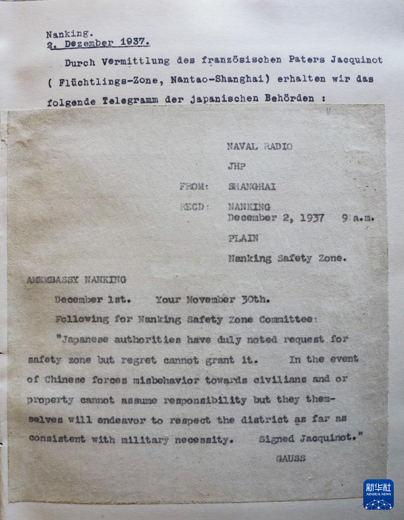 这是8月7日在德国海德堡约翰·拉贝交流中心内拍摄的《拉贝日记》德文原版图书中附录的侵华日军拒绝约翰·拉贝在南京设立安全区请求的电报。