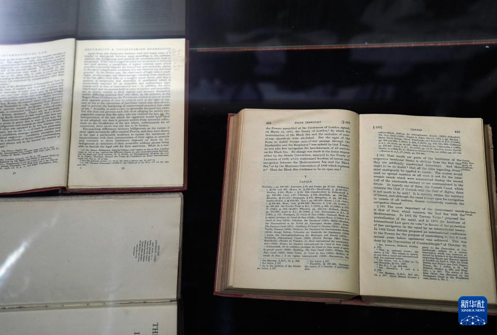 2025年8月1日在梅汝璈故居拍摄的梅汝璈在东京审判中用过的国际法专业工具书。