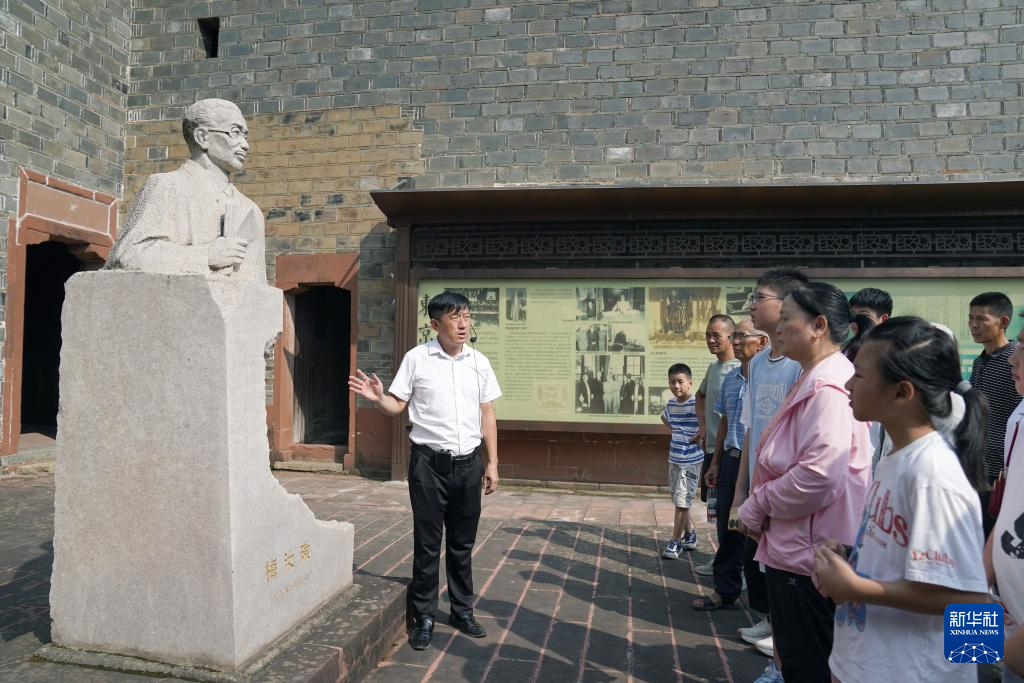 2025年8月1日,梅汝璈故居讲解员梅庭军(左一)向游客介绍梅汝璈。
