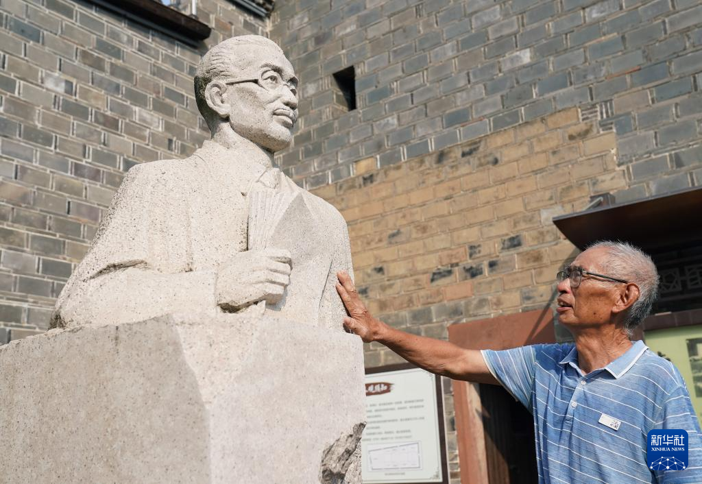 2025年8月1日,78岁的梅氏家族长辈梅华林在梅汝璈故居院中瞻仰梅汝璈雕像。