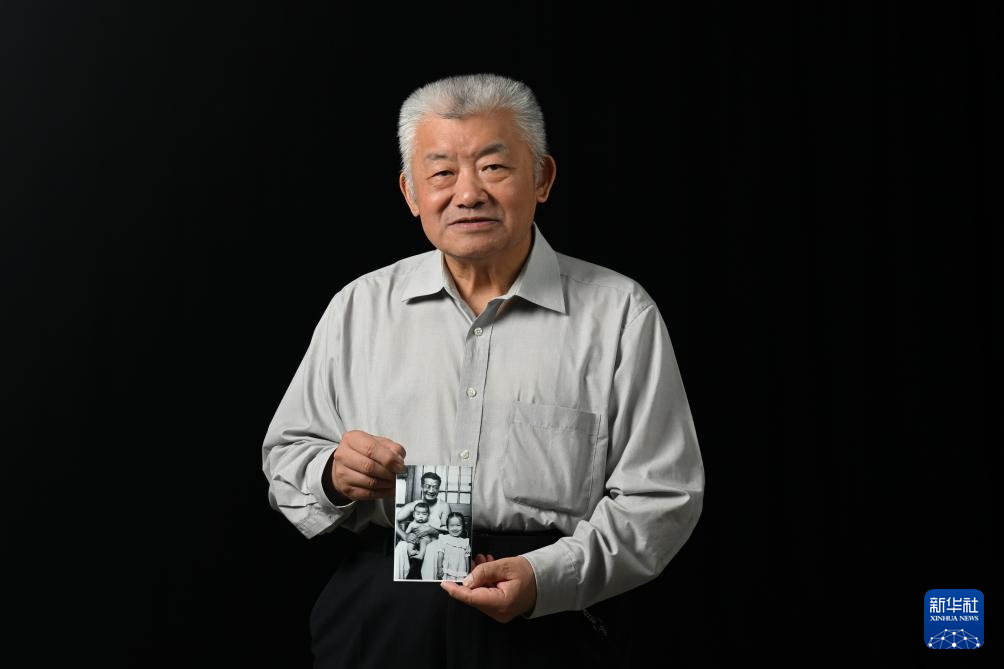 2025年8月8日,梅小璈拿着幼年时期他与父亲梅汝璈和姐姐梅小侃的合影。