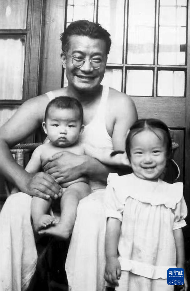 20世纪50年代,梅汝璈与儿子梅小璈(前左)、女儿梅小侃(前右)合影(资料照片)。