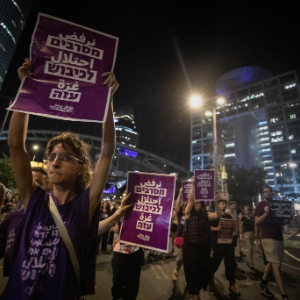 8月17日晚,人们在以色列中部城市特拉维夫的以色列国防部大楼附近参加游行示威活动。