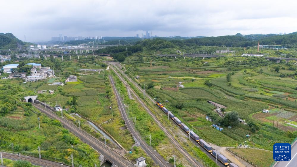 8月19日,贵州首趟多式联运“一单制”班列驶出贵阳国际陆港都拉营站(无人机照片)。
