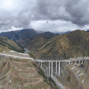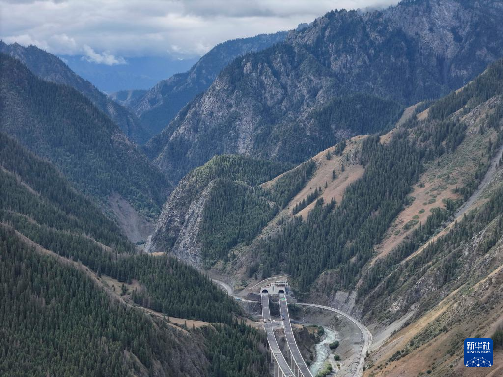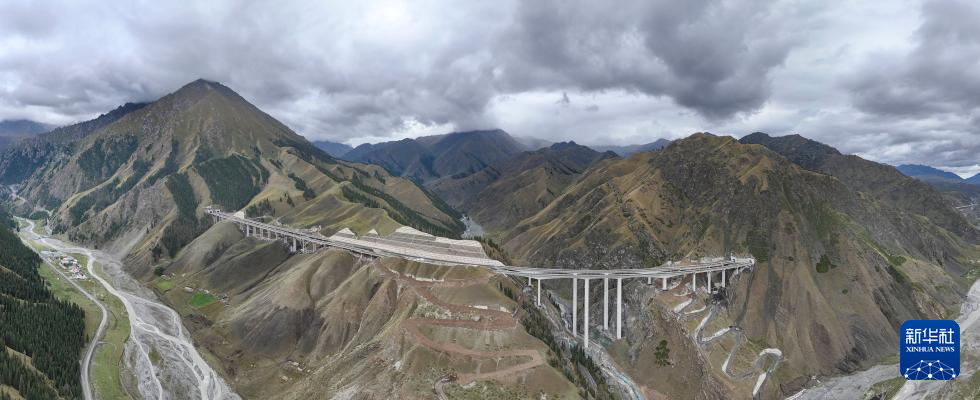 新疆乌尉高速公路穿越天山山脉(8月19日摄,无人机全景照片)。