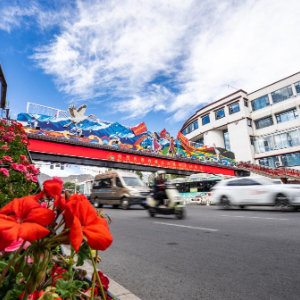在庆祝西藏自治区成立60周年之际,拉萨街头张灯结彩,处处洋溢着喜庆氛围。