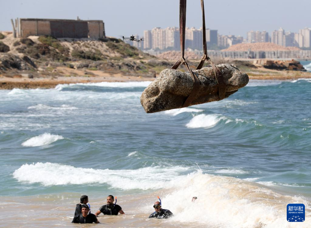 8月21日,在埃及亚历山大附近的海滨,石刻雕像被打捞出水。