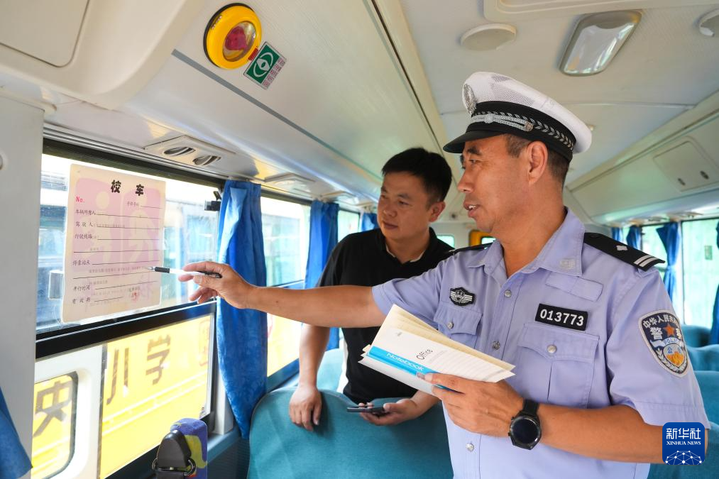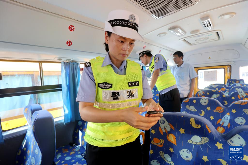 8月22日,湖北省武汉市武昌区交通大队民警对校车进行安全检查。