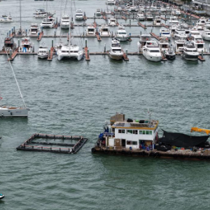 8月23日,游艇停泊在海南省三亚市鸿洲游艇码头避风(无人机照片)。