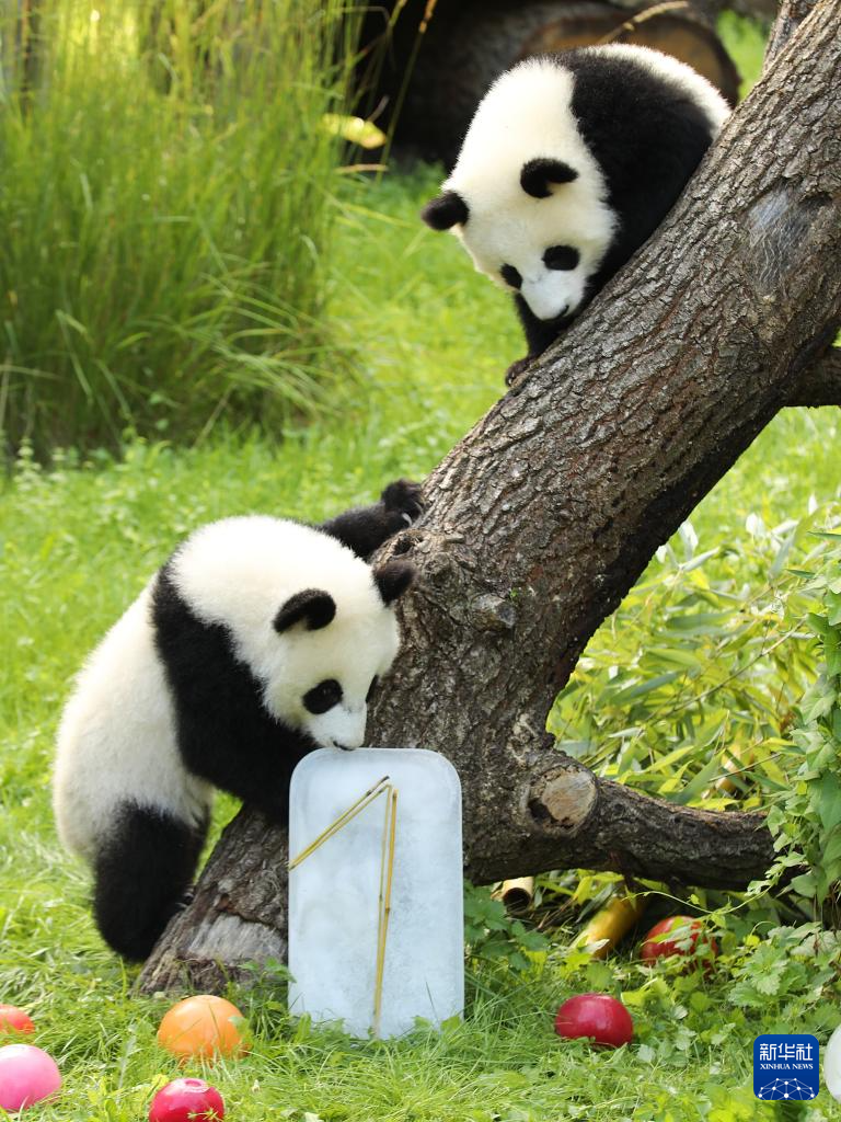 这是8月22日在德国柏林动物园拍摄的大熊猫“梦好”(下)和“梦甜”。