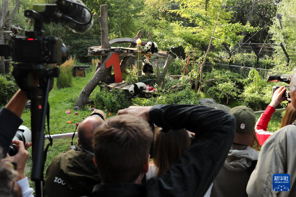 8月22日,人们在德国柏林动物园举行的大熊猫“梦好”和“梦甜”一岁生日庆祝活动上拍摄大熊猫。