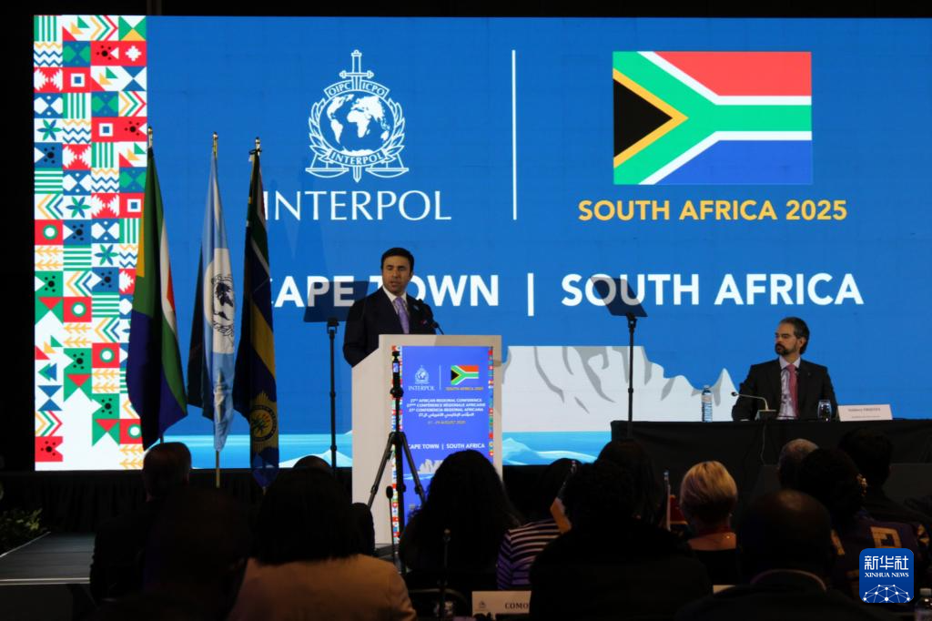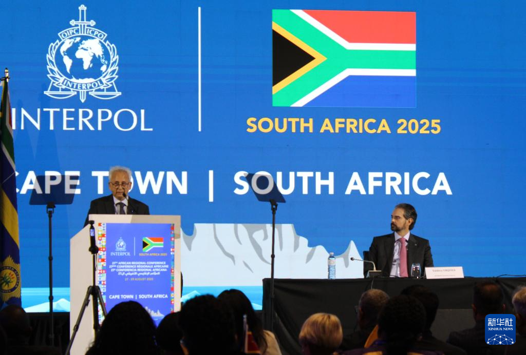 8月27日,在南非开普敦,南非代理警察部长菲罗兹·卡查利亚(左)在第27届国际刑警组织非洲地区会议上致辞。