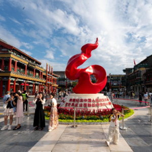8月29日在前门大街北口拍摄的“万众一心”雕塑。