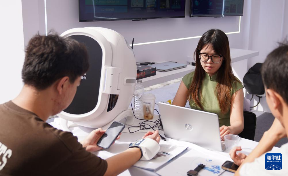 8月29日,一名参观者在展览现场体验中医脉诊仪“把脉”。