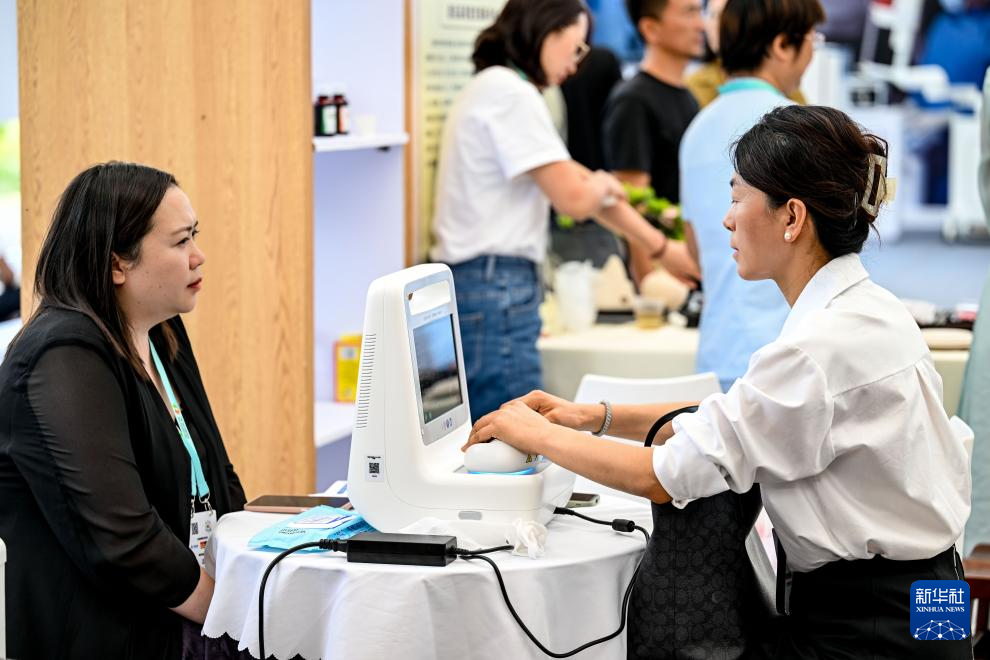 8月29日,一名参观者(右)在展览现场体验中医经络检测仪。
