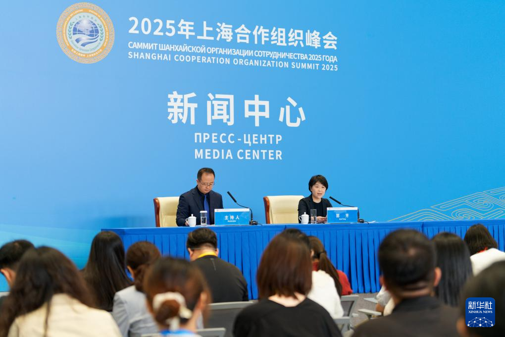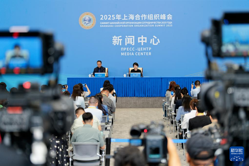 8月30日,在天津梅江国际会展中心,2025年上海合作组织峰会新闻中心举行生态环境部专场吹风会,生态环境部副部长郭芳介绍上合组织生态环境合作情况,并回答记者提问。这是记者在吹风会现场拍摄。