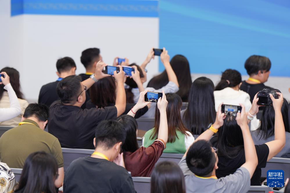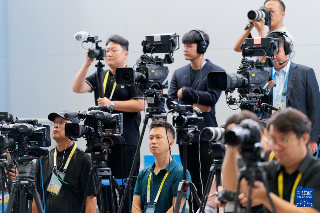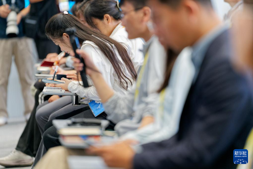 8月30日,在天津梅江国际会展中心,2025年上海合作组织峰会新闻中心举行生态环境部专场吹风会,生态环境部副部长郭芳介绍上合组织生态环境合作情况,并回答记者提问。这是记者在吹风会现场采访。