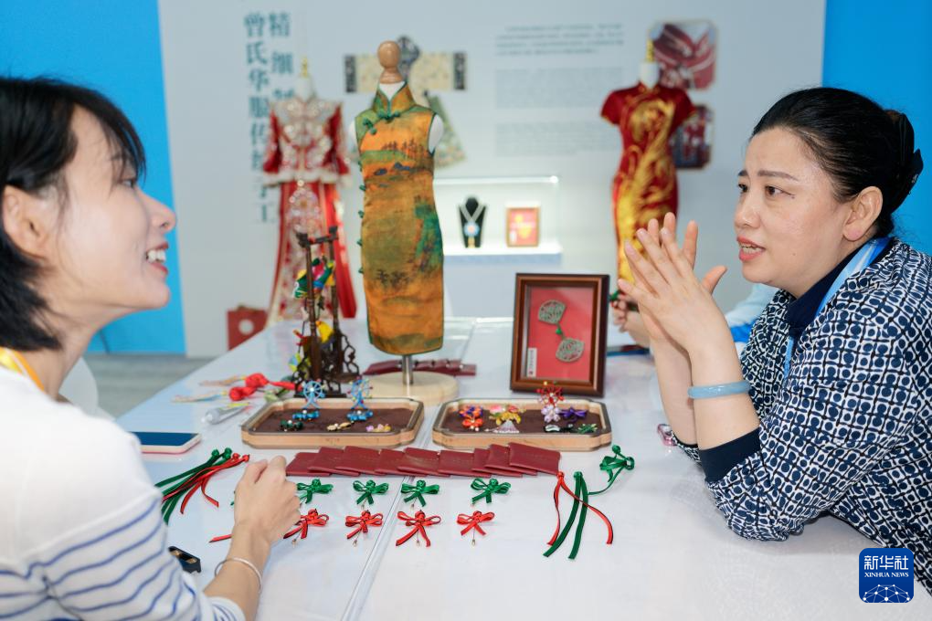 8月31日,工作人员(右)在峰会新闻中心的曾氏华服传统手工精细制作技艺展台向记者介绍盘扣胸针制作技艺。