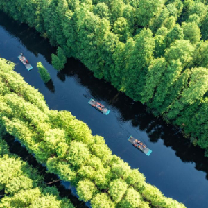 8月30日,游人在江苏省淮安市金湖县水上森林景区乘坐竹筏游览美景(无人机照片)。