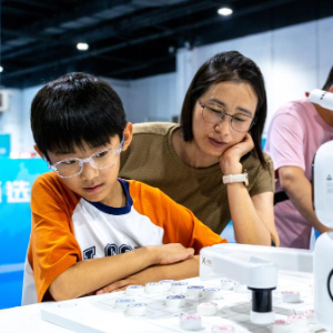 8月31日,在内蒙古呼和浩特市2025北疆书展,小朋友与AI下棋机器人对弈。