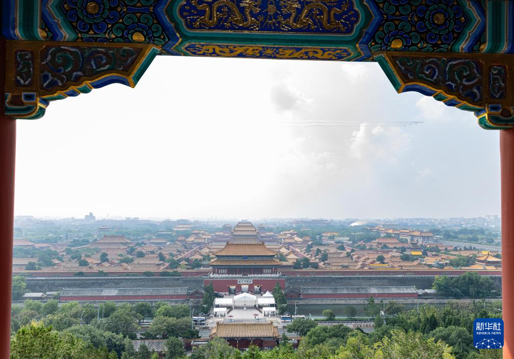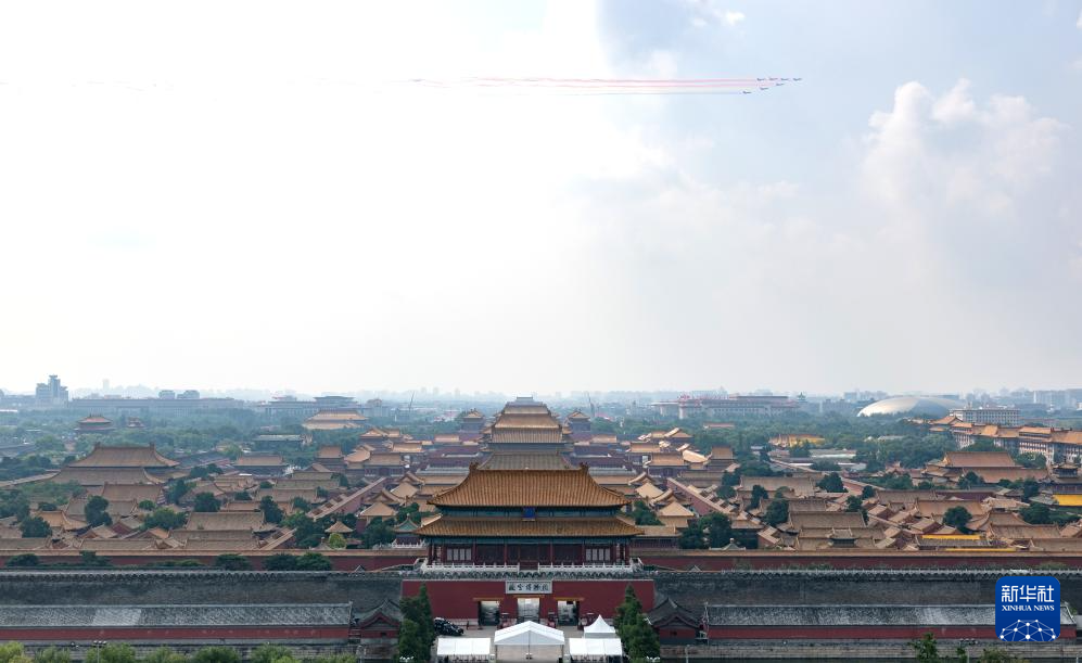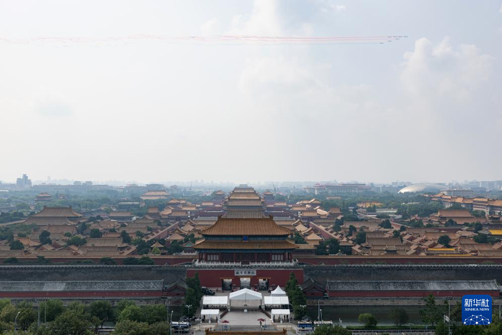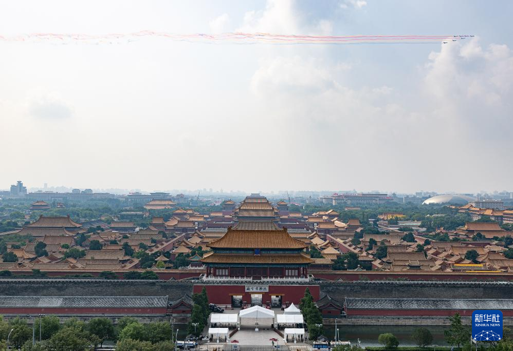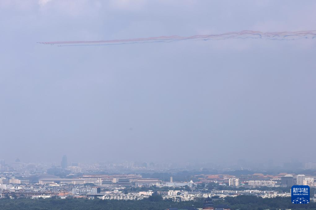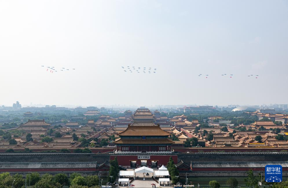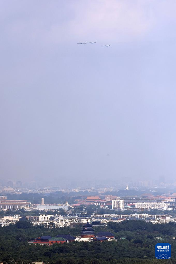 9月3日,纪念中国人民抗日战争暨世界反法西斯战争胜利80周年大会在北京隆重举行。这是空中护旗梯队飞过天安门广场上空。