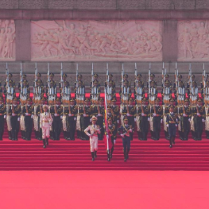 9月3日,纪念中国人民抗日战争暨世界反法西斯战争胜利80周年大会在北京隆重举行。这是国旗护卫队在行进中。