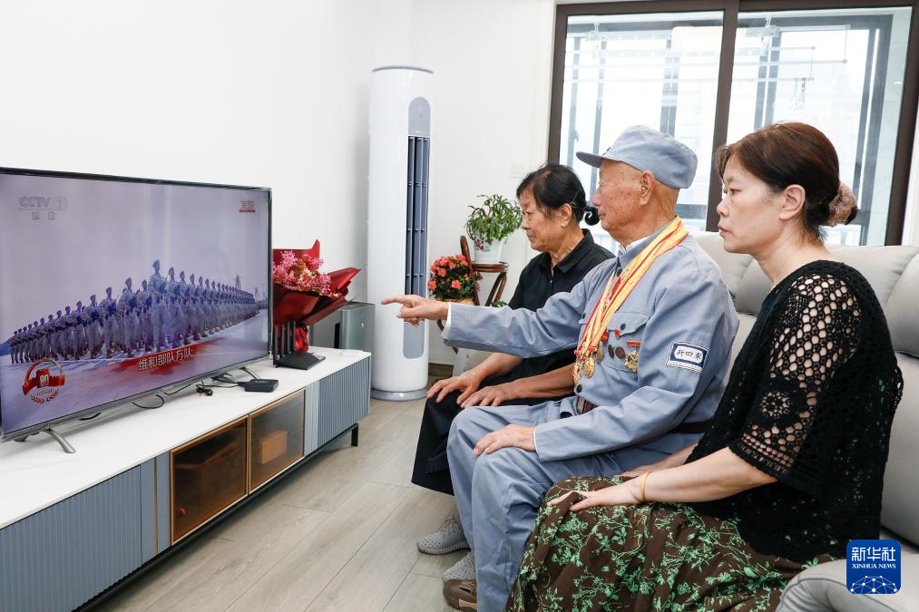 9月3日,江苏海安抗战老兵王承坚和家人一起收看纪念中国人民抗日战争暨世界反法西斯战争胜利80周年大会直播。