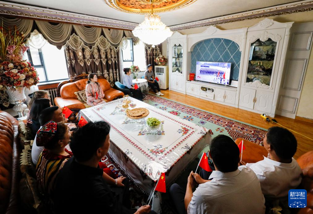 9月3日,在新疆尉犁县兴平镇达西村,村民在家中观看纪念中国人民抗日战争暨世界反法西斯战争胜利80周年大会直播。