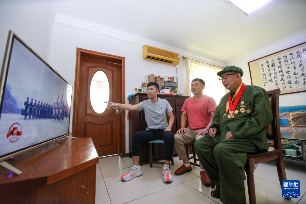 9月3日,广东汕头102岁的抗战老兵陈天在家中观看纪念中国人民抗日战争暨世界反法西斯战争胜利80周年大会直播。
