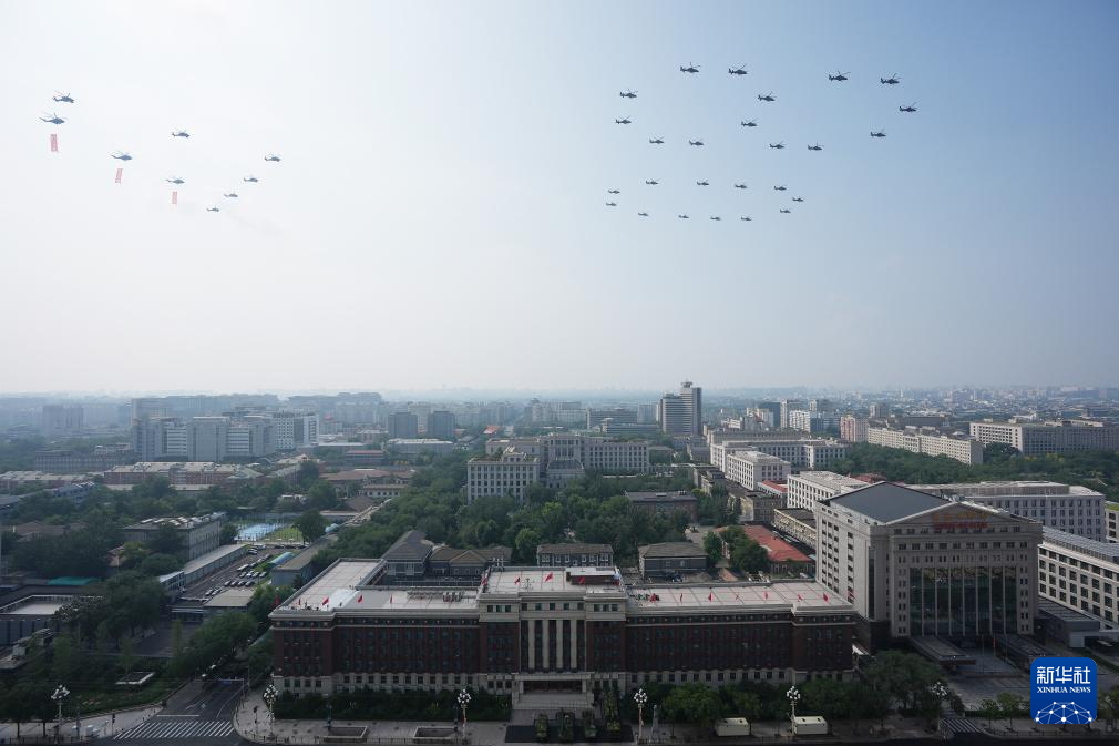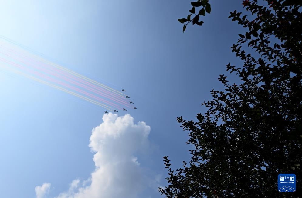 9月3日,纪念中国人民抗日战争暨世界反法西斯战争胜利80周年大会在北京隆重举行。这是空中护旗梯队接受检阅。