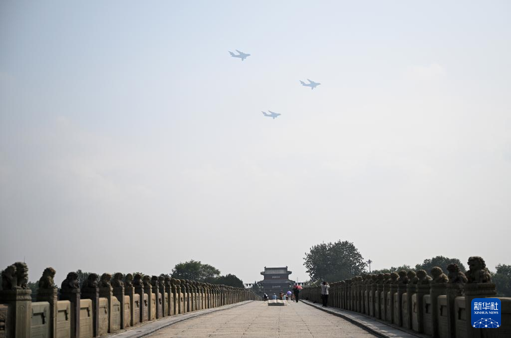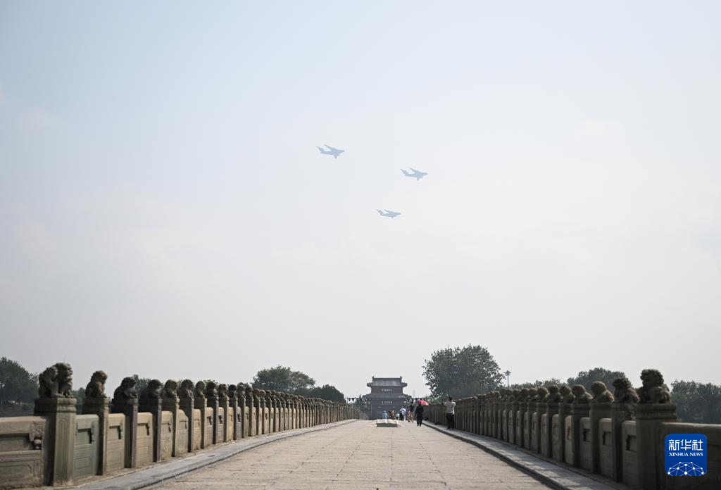 9月3日,纪念中国人民抗日战争暨世界反法西斯战争胜利80周年大会在北京隆重举行。这是市民在卢沟桥观看运输机梯队。