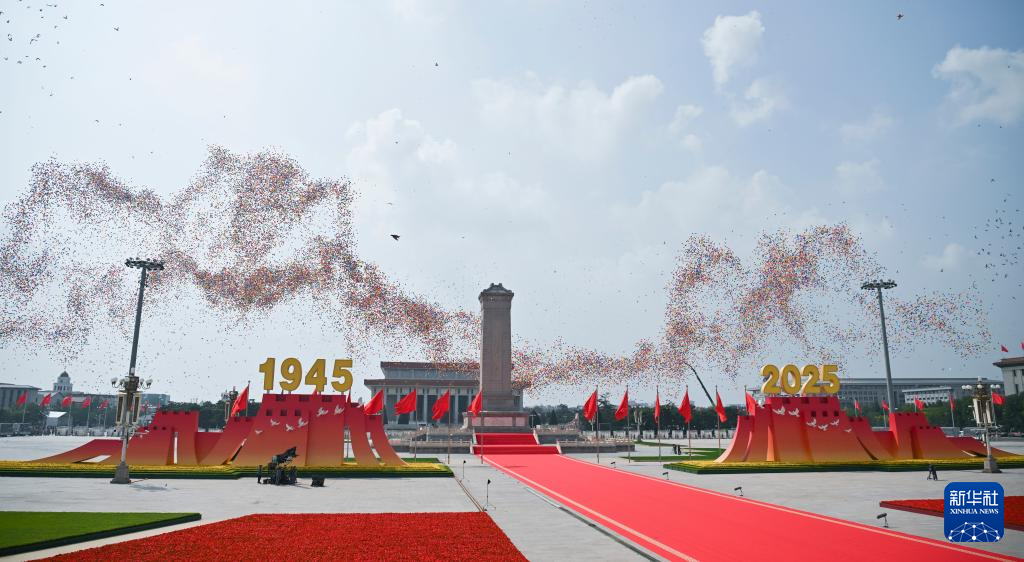 9月3日,纪念中国人民抗日战争暨世界反法西斯战争胜利80周年大会在北京隆重举行。这是纪念大会现场放飞气球。