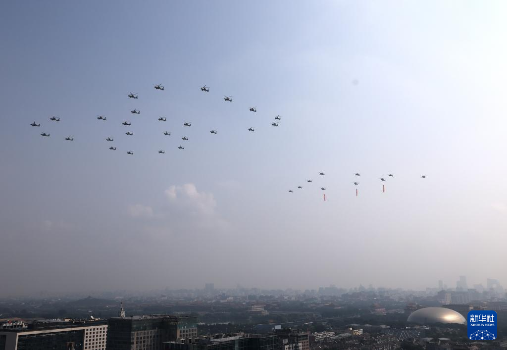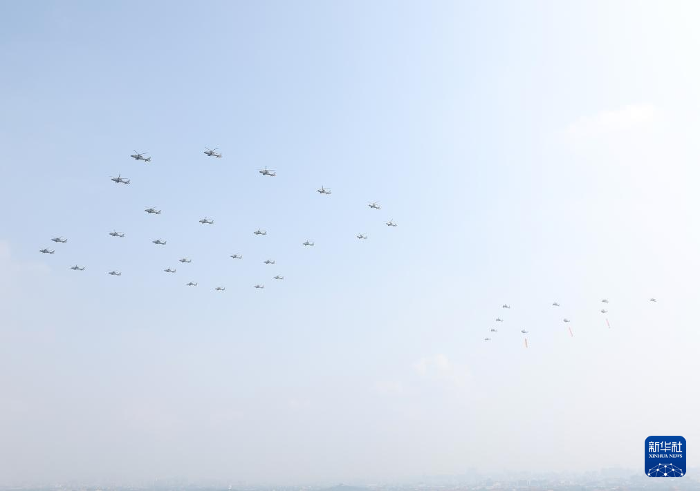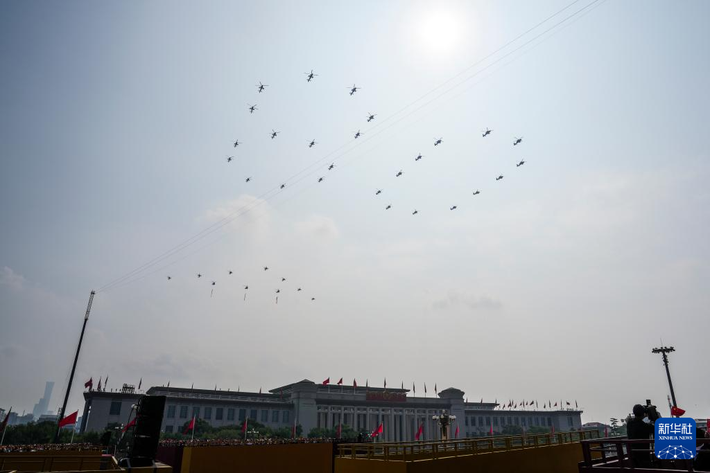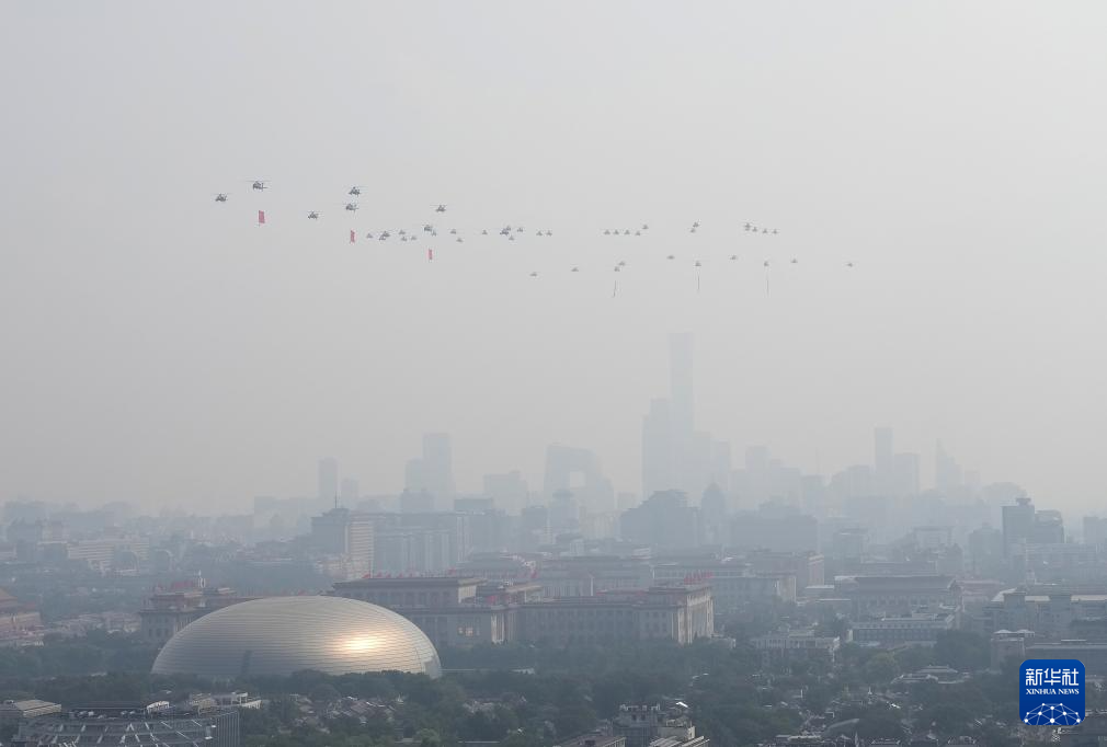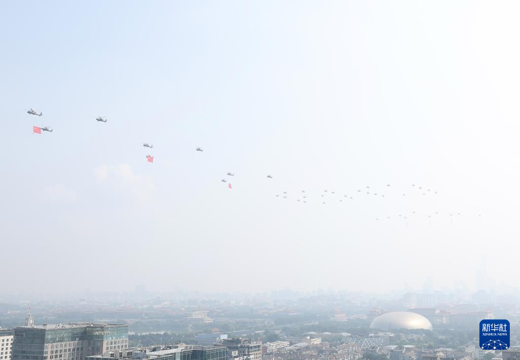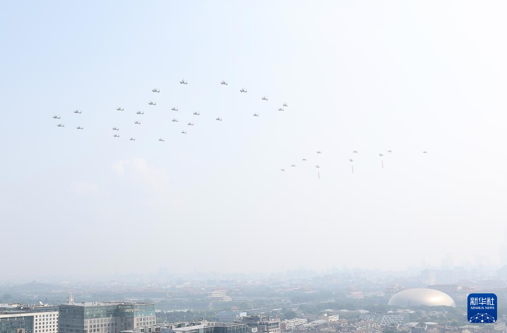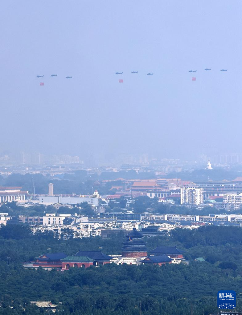 9月3日,纪念中国人民抗日战争暨世界反法西斯战争胜利80周年大会在北京隆重举行。这是空中护旗梯队通过天安门广场。