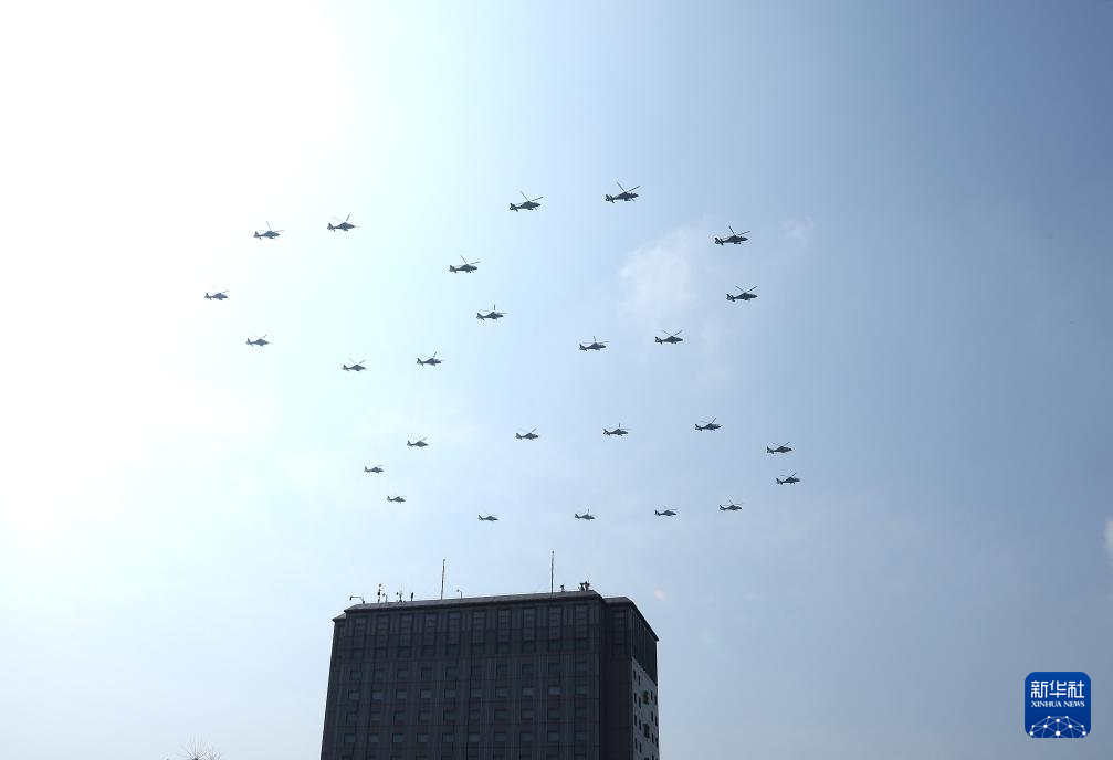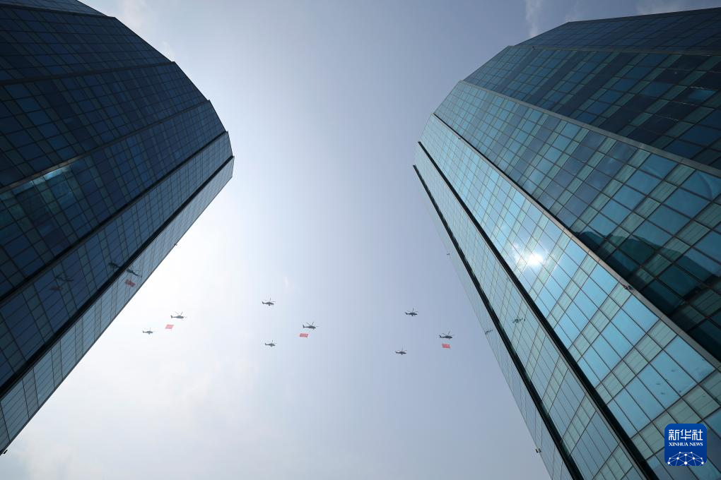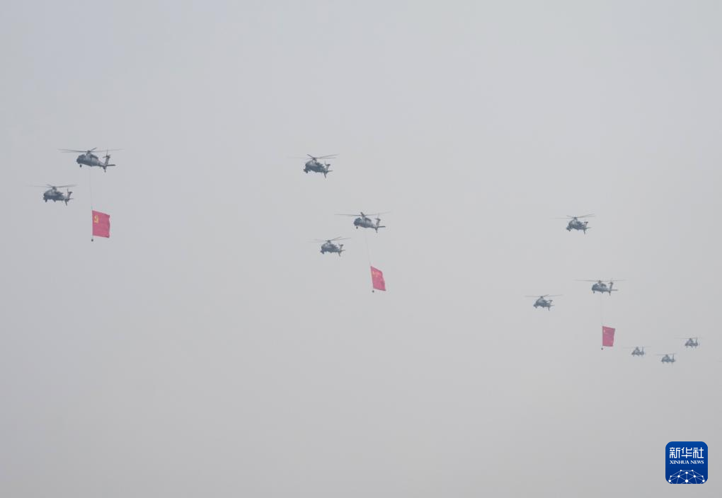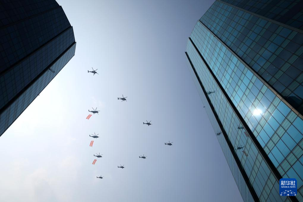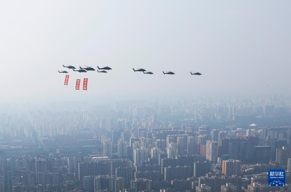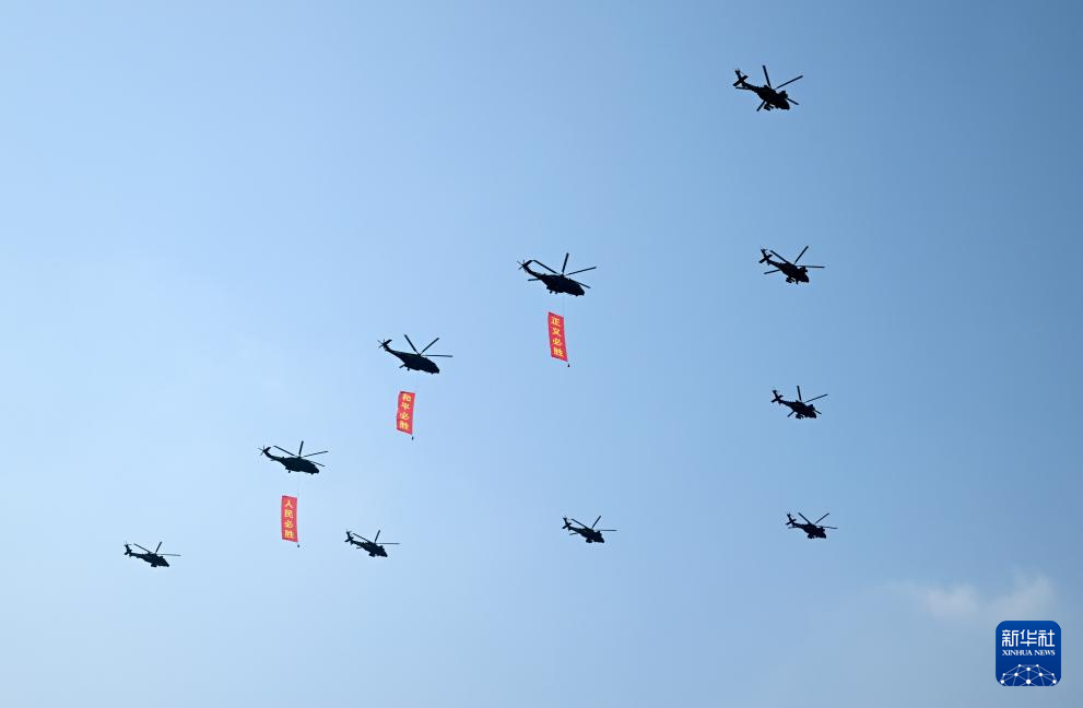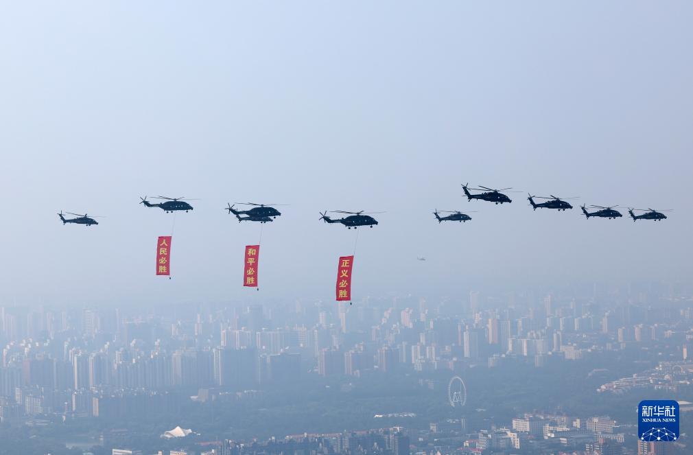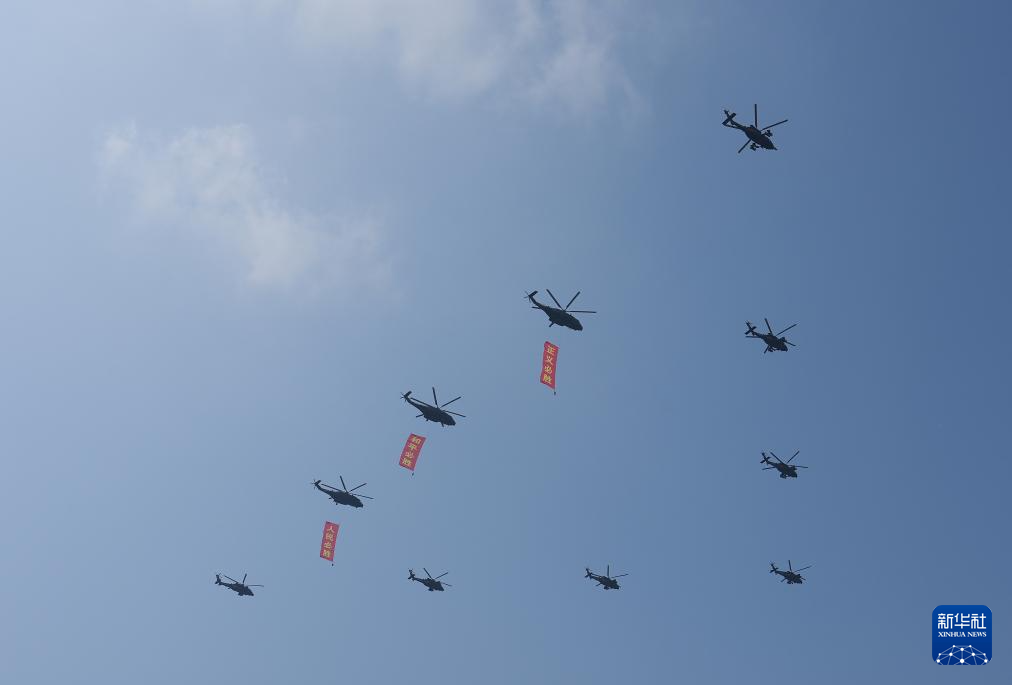 9月3日,纪念中国人民抗日战争暨世界反法西斯战争胜利80周年大会在北京隆重举行。这是空中护旗梯队通过天安门广场。