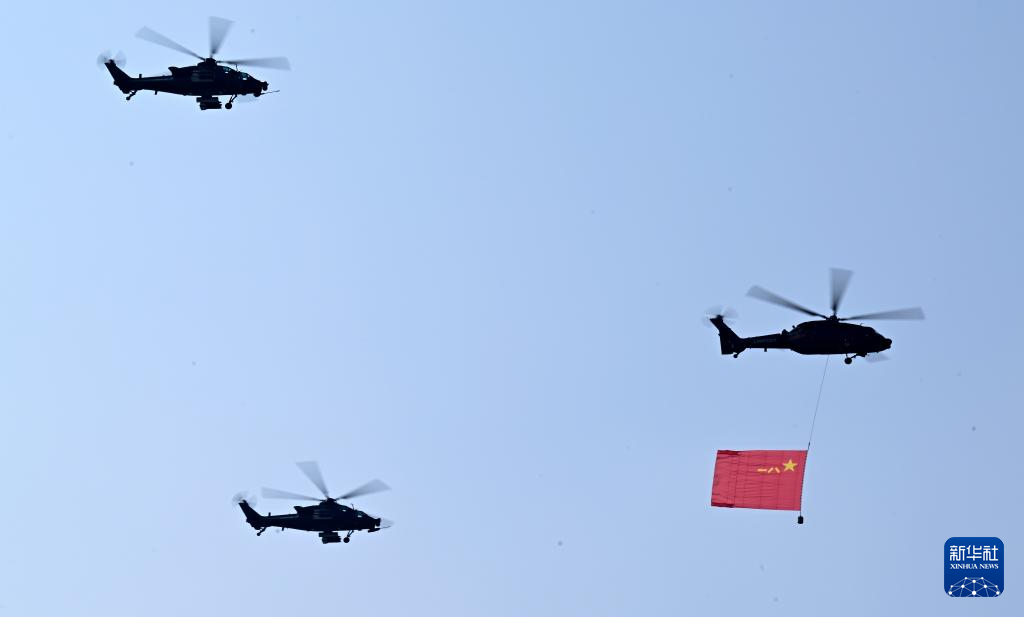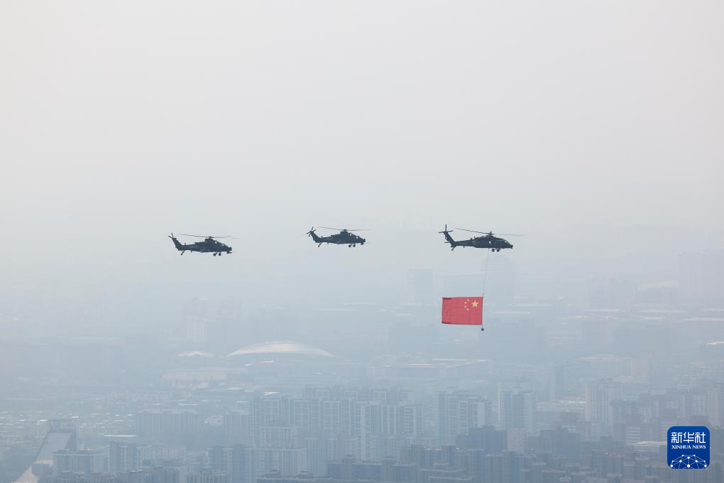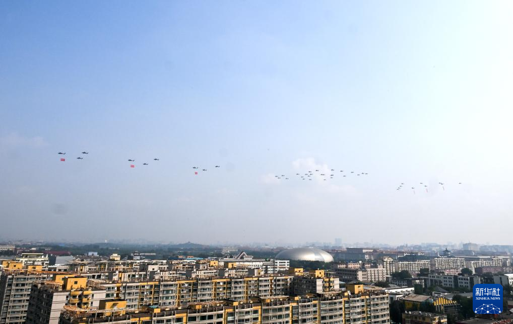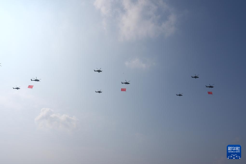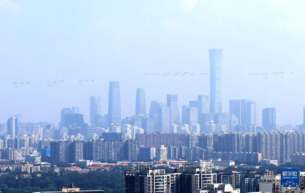 9月3日,纪念中国人民抗日战争暨世界反法西斯战争胜利80周年大会在北京隆重举行。这是空中护旗梯队。