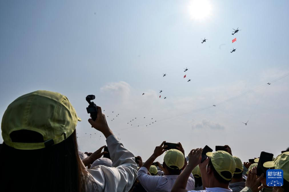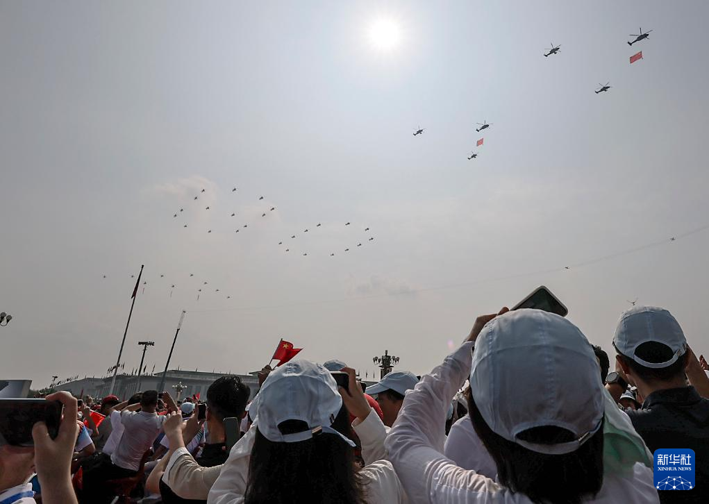 9月3日,纪念中国人民抗日战争暨世界反法西斯战争胜利80周年大会在北京隆重举行。这是观众拍摄空中护旗梯队通过天安门广场。