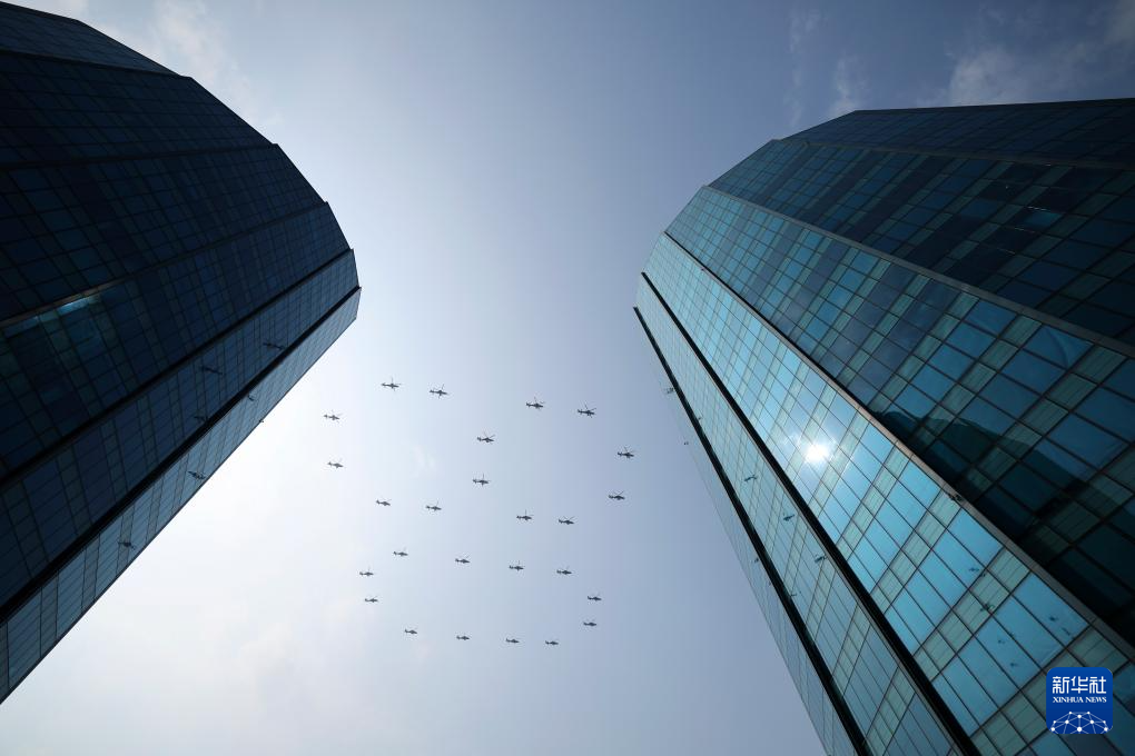 9月3日,纪念中国人民抗日战争暨世界反法西斯战争胜利80周年大会在北京隆重举行。这是空中护旗梯队飞过天安门广场上空。
