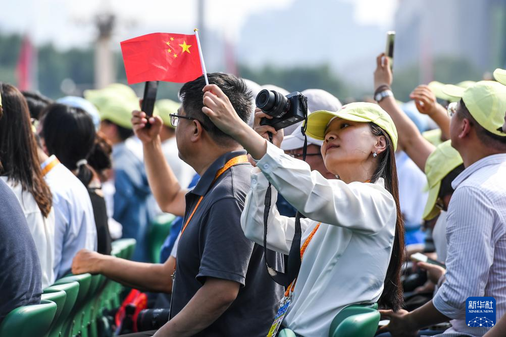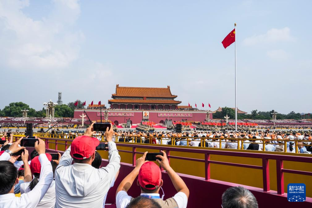 9月3日,纪念中国人民抗日战争暨世界反法西斯战争胜利80周年大会在北京隆重举行。这是观众拍摄手中的国旗。