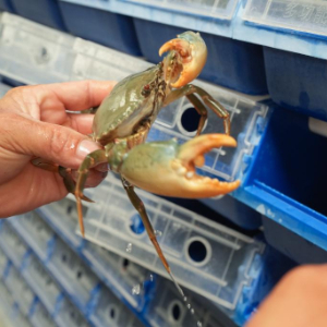 9月2日,在宁海县一市镇的一家青蟹生产企业,工作人员在暂储青蟹的“蟹公寓”中查看其健康状态。