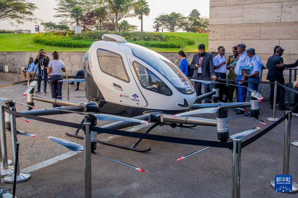 这是9月4日在卢旺达首都基加利举行的第九届非洲航空峰会上拍摄的中国亿航智能旗舰产品EH216-S电动垂直起降飞行器(eVTOL)。