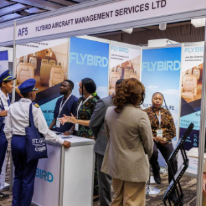 9月4日,人们在卢旺达首都基加利举行的第九届非洲航空峰会上交流。