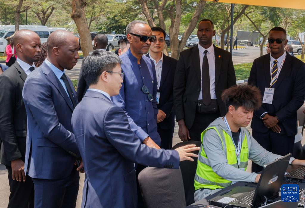 9月4日,在卢旺达首都基加利举行的第九届非洲航空峰会上,卢旺达总统卡加梅(左四)在中国亿航智能公司展区观看飞行器操作演示。