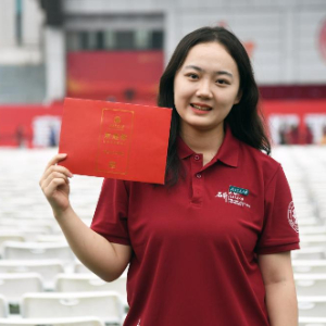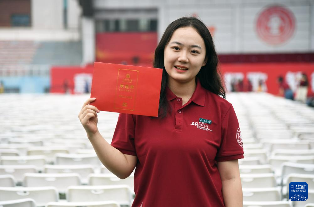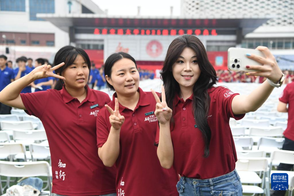 9月5日,一名新生在北京交通大学2025级新生开学典礼现场拍照留念。